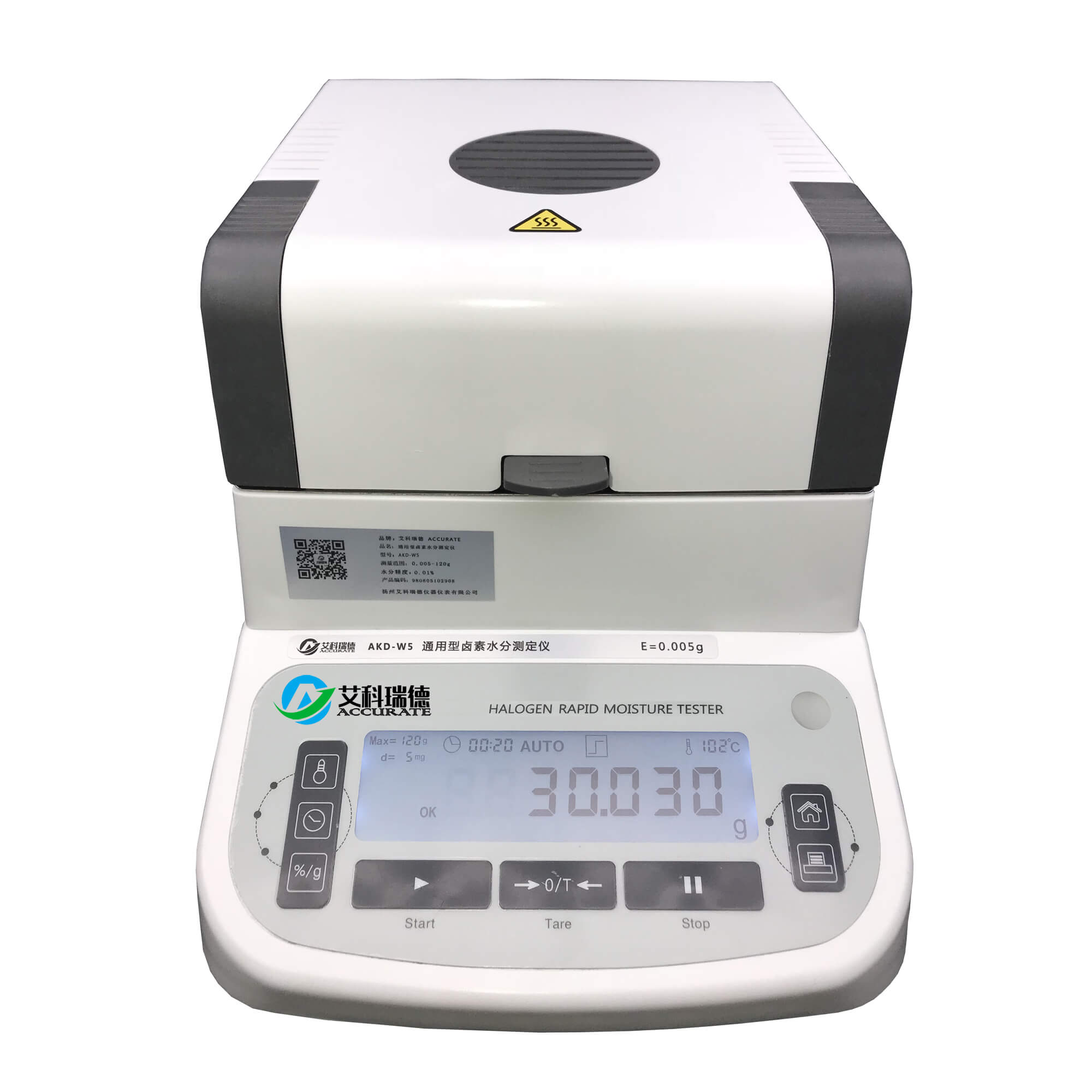 鹵素水分儀又分為三種精度,因鹵素水分儀在測試過程中實時檢測重量,因此重量的精確度顯得尤其重要,重量的精度越高水分值精度就越高,所以鹵素水分儀的精度主要是按稱重精度來區分的,主要有這么三種:0.005-120g、0.001-120g、0.0001-120g,這三款對應的水分顯示值分別是0.00%、0.00%、0.000%。用戶在選擇時可根據實際需求選擇合適的精度。鹵素水分儀的測試也是簡單方便的,取樣在托盤上,蓋上加熱倉蓋并按開始鍵即可,儀器會自動加熱并顯示重量和水分直到水分全部烘干自動停止并鎖定結果,還可選配打印機將測試結果打印出來。